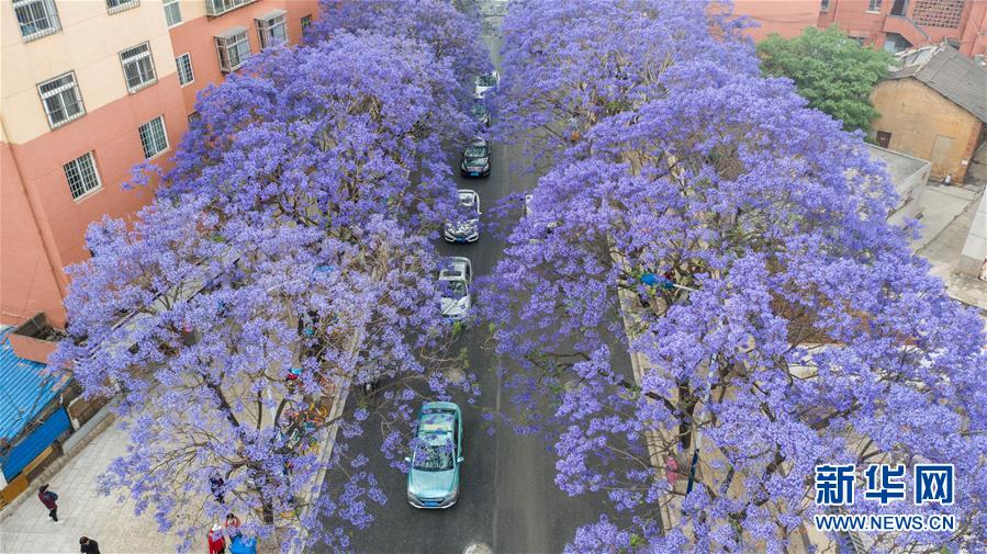 這是5月2日在昆明市教場(chǎng)中路拍攝的藍(lán)花楹(無(wú)人機(jī)照片)。近日,云南省昆明市部分街區(qū)的藍(lán)花楹競(jìng)相開放,為春城增添靚麗風(fēng)景。新華社記者藺以光攝