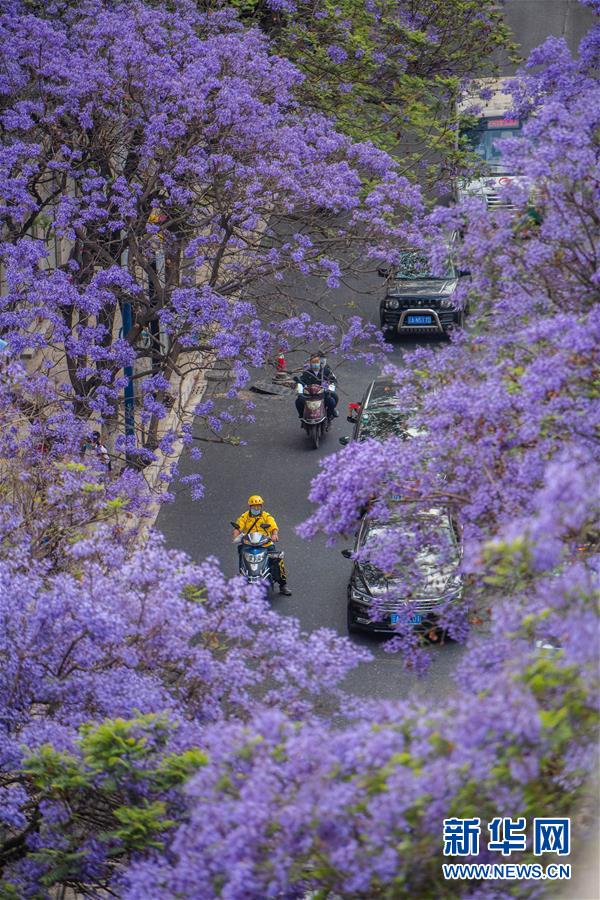 這是5月2日在昆明市教場中路拍攝的藍花楹。近日,云南省昆明市部分街區(qū)的藍花楹競相開放,為春城增添靚麗風(fēng)景。新華社記者胡超攝