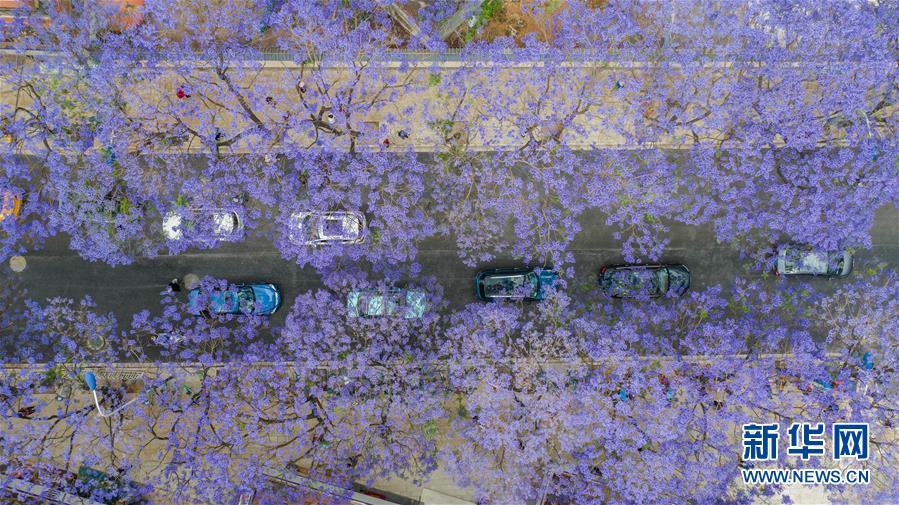 這是5月2日在昆明市教場中路拍攝的藍花楹(無人機照片)。近日,云南省昆明市部分街區(qū)的藍花楹競相開放,為春城增添靚麗風景。新華社記者胡超攝