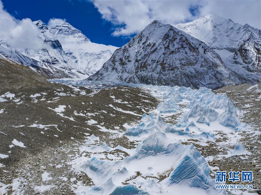 位于珠穆朗瑪峰腳下海拔5400米左右的中絨布冰川(4月30日攝,無(wú)人機(jī)照片)。位于珠穆朗瑪峰腳下海拔5400米左右的中絨布冰川,巍峨壯觀,冰塔林托起世界最高峰,讓人嘆為觀止。新華社記者旦增尼瑪曲珠攝