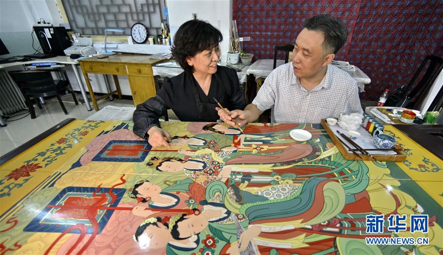 5月4日,屏風(fēng)設(shè)計人、國家級非物質(zhì)文化遺產(chǎn)“金漆鑲嵌髹飾技藝”代表性傳承人柏群(右)和領(lǐng)銜主創(chuàng)的工藝美術(shù)大師胡昕進行屏風(fēng)畫面的最后檢視。新華社記者 李欣 攝