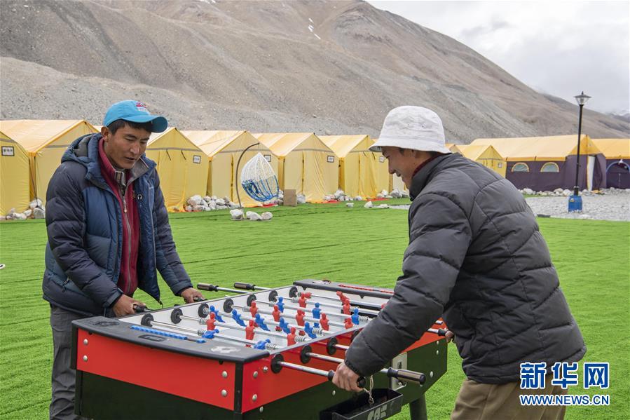 登山隊員在珠峰大本營玩桌上足球(5月1日攝)。新華社記者孫非攝
