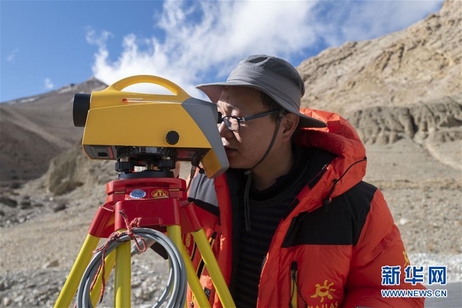 國測一大隊隊員金良在操作水準儀(4月18日攝)。水準測量是一種利用提供水平視線的儀器(如水準儀、水準標尺),測定地面不同點之間的高差,并以此推算高度的一種方法,是經(jīng)典大地測量的重要技術(shù)之一。在目前正在進行的2020珠峰高程測量中,部分國測一大隊隊員承擔了水準測量的任務(wù)。新華社記者晉美多吉攝