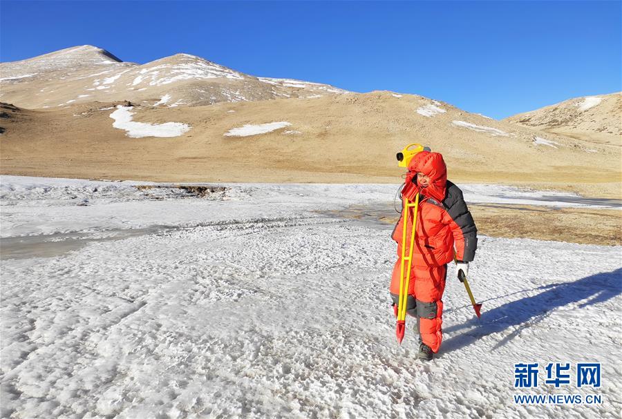國測一大隊隊員霍申申在西藏定日縣扎西宗鄉(xiāng)境內(nèi)進行水準測量(4月4日攝)。水準測量是一種利用提供水平視線的儀器(如水準儀、水準標尺),測定地面不同點之間的高差,并以此推算高度的一種方法,是經(jīng)典大地測量的重要技術(shù)之一。在目前正在進行的2020珠峰高程測量中,部分國測一大隊隊員承擔了水準測量的任務(wù)。新華社發(fā)(楊明攝)