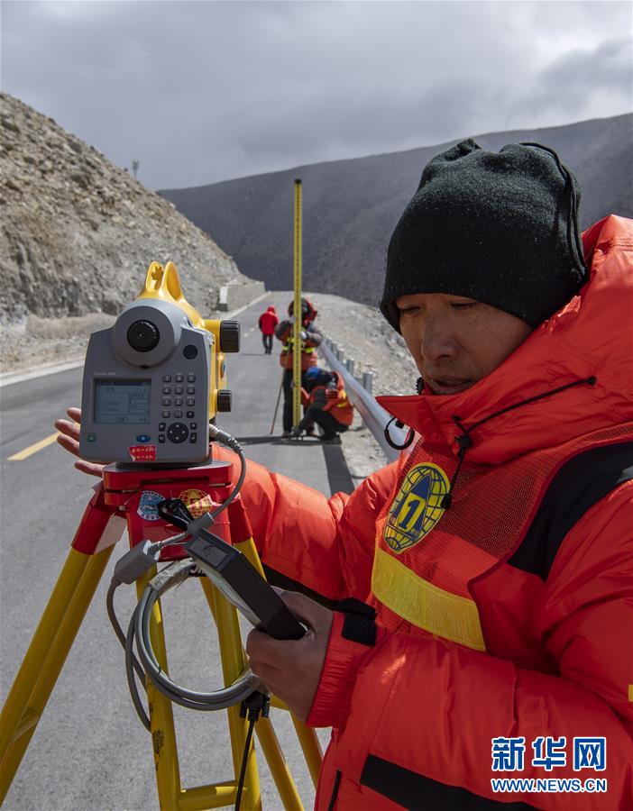 國測一大隊隊員楊明在西藏定日縣曲當鄉(xiāng)境內(nèi)進行水準測量(5月4日攝)。水準測量是一種利用提供水平視線的儀器(如水準儀、水準標尺),測定地面不同點之間的高差,并以此推算高度的一種方法,是經(jīng)典大地測量的重要技術(shù)之一。在目前正在進行的2020珠峰高程測量中,部分國測一大隊隊員承擔了水準測量的任務(wù)。新華社記者普布扎西攝