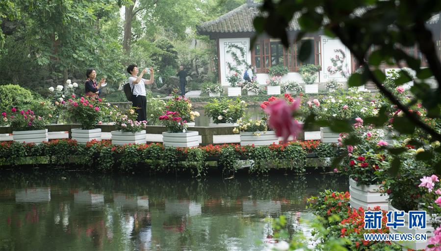 5月5日,游客在西湖畔的郭莊觀看月季花展?!拔逡弧逼陂g,第八屆杭州西湖月季花精品展在杭州西子湖畔舉行,展出國內(nèi)外700余個(gè)月季品種。新華社記者翁忻旸攝