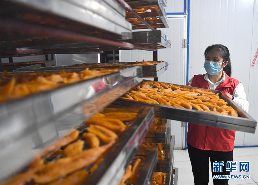 唐莉在平樂(lè)縣張家鎮(zhèn)老埠村合作社查看紅薯干生產(chǎn)情況(5月4日攝)。新華社記者周華攝