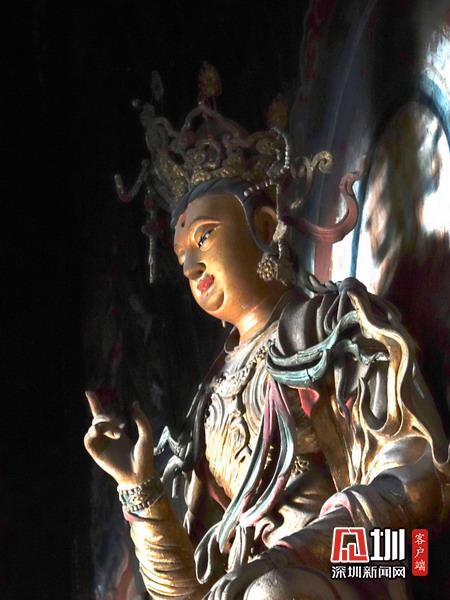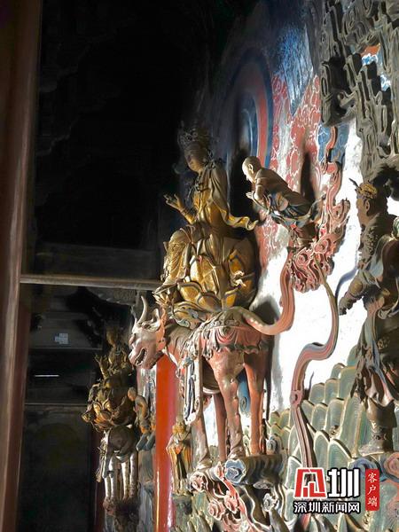 報恩寺布局結構酷似北京紫禁城,被稱為“深山故宮”。寺內古木參天,氣象森嚴,飛檐凌空,金碧輝煌。大悲殿中的用整根楠木雕成的千手千眼觀音像、華嚴藏中的轉輪經藏和泥塑蟠龍,以及遍布全寺的彩繪壁畫,都是世間罕見的藝術珍品。李仁奇攝