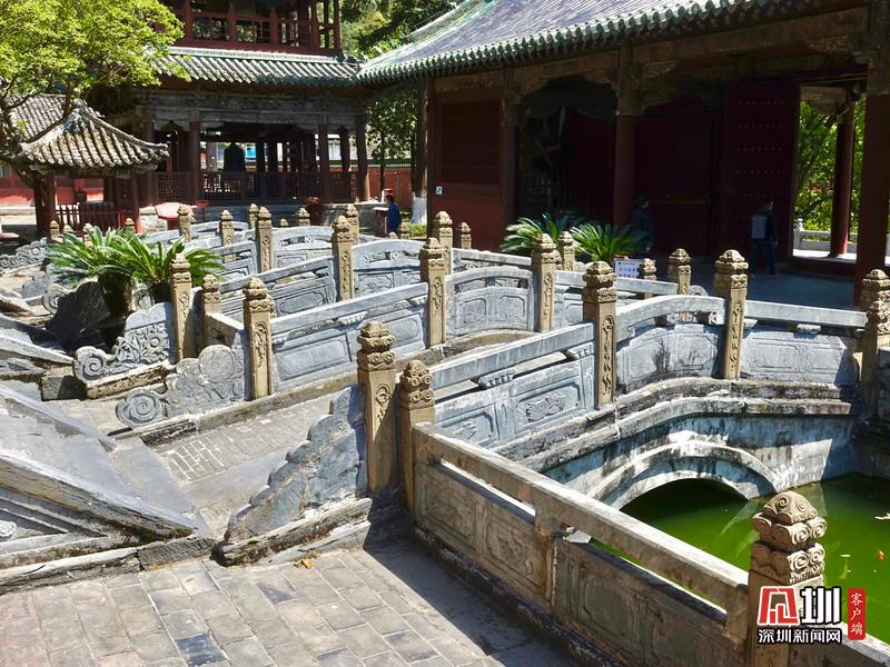 主體建筑布置在一條中軸線上,它坐西向東,由東而西次遞升高,寺前廣場上有“華表”兩座,寺內有“金水橋”三座,基本布局完全同于故宮前庭,山門外一對八字墻,形制也極似故宮的排場。主體建筑為大雄寶殿,以它為中心分為前中后三個院落。整個建筑群左右對稱,渾然一體,構成一座布局嚴謹、裝飾華麗的宮殿與寺廟特征兼?zhèn)涞墓沤ㄖ骸@钊势鏀z