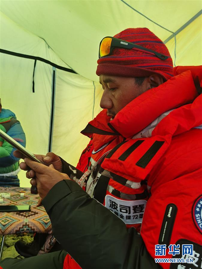 5月7日,登山隊隊長次洛在前進營地查看攀登計劃。當日,2020珠峰高程測量登山隊抵達海拔6500米的前進營地后,測量登山隊同由西藏圣山登山探險服務有限公司的高山向導和協(xié)作隊員組成的修路隊、運輸隊召開協(xié)調會議,布置下一步任務。新華社特約記者扎西次仁攝