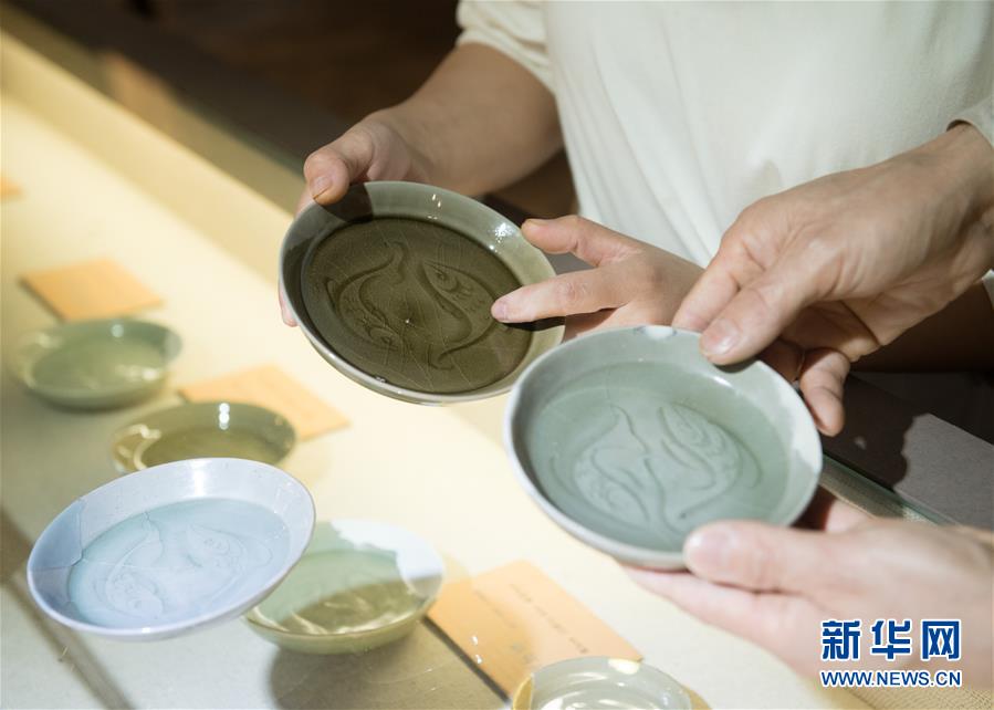 5月8日,“90后”瓷人湯佳(左)將自己制作的魚紋盤帶到龍泉青瓷裝飾紋樣研究所,跟項(xiàng)宏金收藏的古瓷器比對(duì)。1965年出生的項(xiàng)宏金,被浙江龍泉年輕一代瓷人稱為“項(xiàng)哥”,他從20世紀(jì)90年代開始收集龍泉青瓷標(biāo)本,研究青瓷紋樣。2014年出版著作《龍泉青瓷裝飾紋樣》,次年開設(shè)龍泉青瓷裝飾紋樣研究所,將自己收藏的千余件標(biāo)本跟瓷器愛(ài)好者、創(chuàng)作者免費(fèi)分享。新華社記者翁忻旸攝