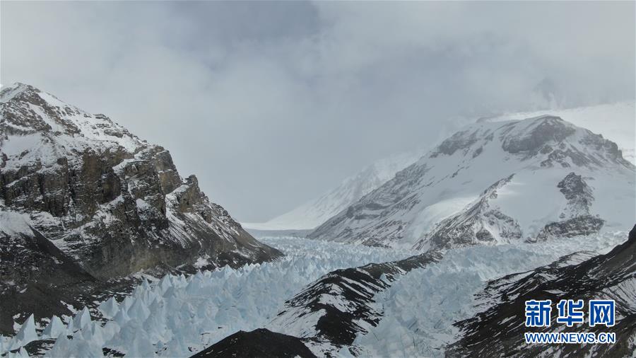 過渡營地附近的冰塔林(5月8日攝,無人機(jī)照片)。珠峰過渡營地海拔5800米,是連接前進(jìn)營地和珠峰大本營的重要一站。登山愛好者從大本營徒步大約四個小時就能抵達(dá)過渡營地。此段路程亂石林立,同時也能欣賞壯美的冰川。新華社記者孫非攝