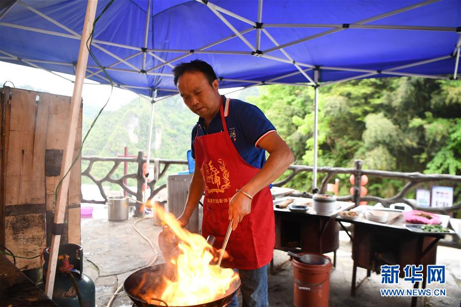 施六金在自家開的農(nóng)家樂為客人準備午餐(4月25日攝)。1973年出生于十八洞村的施六金,由于父親患病很早就放棄學業(yè)和母親扛起了家庭的重擔。為了生活,他還曾遠去東南亞打工。2015年,看到家鄉(xiāng)的變化,施六金回到村里開起了農(nóng)家樂,年度家庭人均純收入也從2014年的1715元增長到了2019年的35696元。2018年,施六金與心愛的人組建了家庭。今年初,施六金與愛人迎來了一個大胖小子。“做人做事要懂得回報和感恩?!笔┝鸾o剛出生的兒子取名施澤恩。新華社記者薛宇舸攝