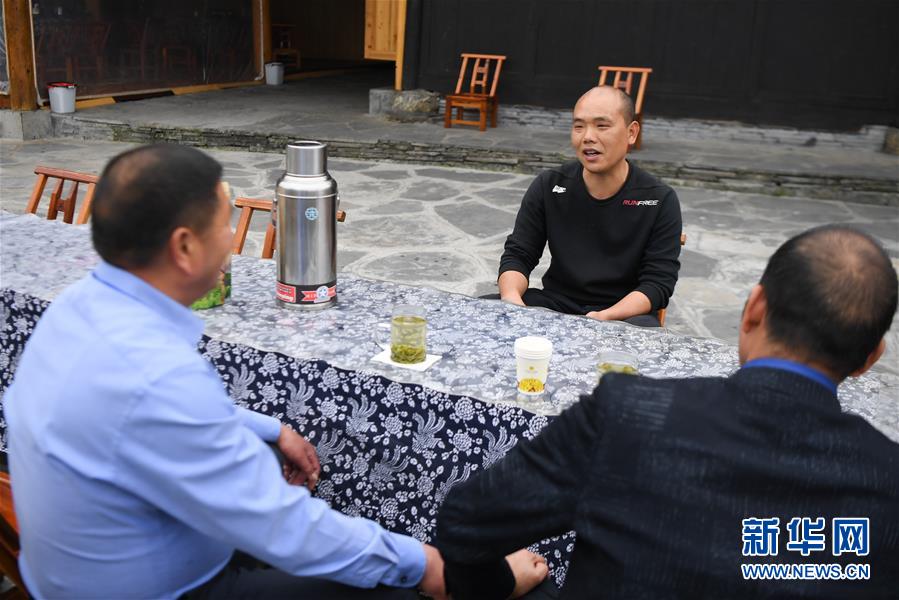 楊正邦(中)在和來自浙江的住客攀談(4月25日攝)。楊正邦1978年出生于十八洞村,在外打工多年。近些年,眼看來十八洞村的游客越來越多,村里越來越熱鬧,楊正邦在2017年結(jié)束自己的打工生涯回鄉(xiāng)發(fā)展。他先是在村里擺起小吃攤,2018年開起農(nóng)家樂,去年又搭起新房子擴(kuò)建成民宿,年度家庭人均純收入從2014年的1923元增加到2019年的7173元。新華社記者薛宇舸攝