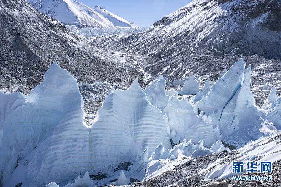 珠峰海拔5800米至海拔6500米的冰塔林(5月9日攝)。從海拔5800米的珠峰過渡營地到海拔6500米的前進營地,冰塔林沿山谷排列,蔚為壯觀。新華社記者孫非攝