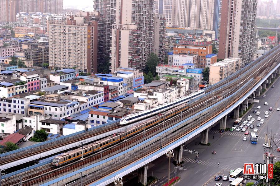 2020年5月11日,四川省成都市,犀浦站是全國(guó)首個(gè)鐵路與地鐵換乘車(chē)站。圖為動(dòng)車(chē)、地鐵同時(shí)運(yùn)行在線路上。
