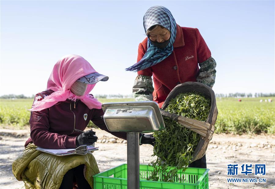 5月11日,在寧夏百瑞源賀蘭山基地,工作人員對采摘的枸杞芽茶進(jìn)行稱重。當(dāng)日,寧夏百瑞源賀蘭山基地枸杞芽茶全面進(jìn)入采摘季。據(jù)了解,該基地茶園面積300余畝,助力附近200多名農(nóng)民就業(yè)增收。新華社記者楊植森攝