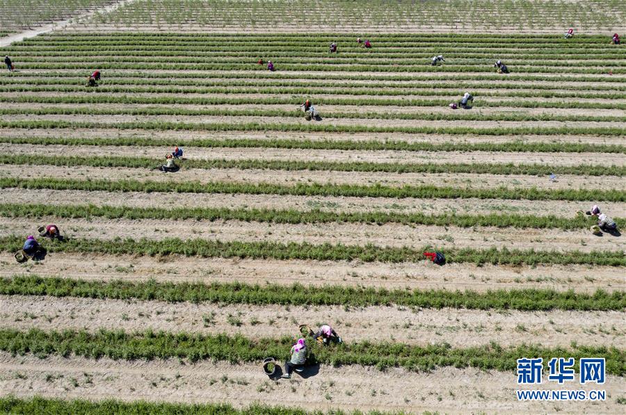 5月11日,采茶工在寧夏百瑞源賀蘭山基地采摘枸杞芽茶(無人機(jī)照片)。當(dāng)日,寧夏百瑞源賀蘭山基地枸杞芽茶全面進(jìn)入采摘季。據(jù)了解,該基地茶園面積300余畝,助力附近200多名農(nóng)民就業(yè)增收。新華社記者楊植森攝