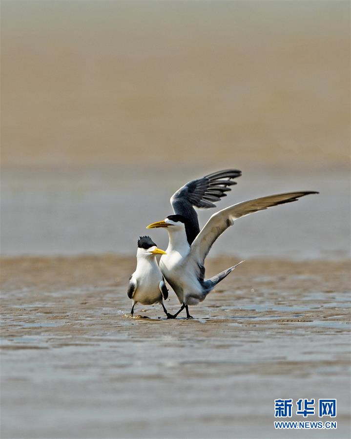 眼下正是大鳳頭燕鷗繁育的時節(jié),在福建閩江河口濕地核心區(qū)鱔魚灘的沙洲上,大鳳頭燕鷗正相互嬉戲(5月9日攝)。新華社記者梅永存攝