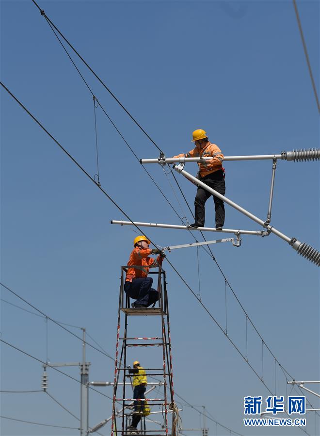 5月12日,中國鐵路上海局集團(tuán)公司上海高鐵維修段的技術(shù)人員在商合杭高鐵浙江湖州段調(diào)整接觸網(wǎng)導(dǎo)線。近日,商合杭高鐵合肥至湖州段聯(lián)調(diào)聯(lián)試正有條不紊進(jìn)行中。中國鐵路上海局集團(tuán)公司上海高鐵維修段抽調(diào)49名精兵強(qiáng)將,持續(xù)對管轄范圍內(nèi)的高鐵線路、信號、接觸網(wǎng)線進(jìn)行調(diào)試,為下一階段打下基礎(chǔ)。據(jù)了解,商合杭高鐵合湖段聯(lián)調(diào)聯(lián)試之后將轉(zhuǎn)入運(yùn)行試驗(yàn)階段,驗(yàn)收合格并通過安全評估后,力爭6月底具備開通運(yùn)營條件。新華社記者黃宗治攝