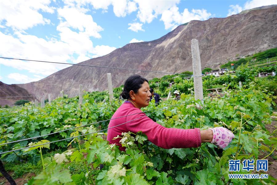 在西藏昌都市芒康縣木許鄉(xiāng)阿東村,村民在葡萄園里忙碌(5月6日攝)。新華社記者詹彥攝