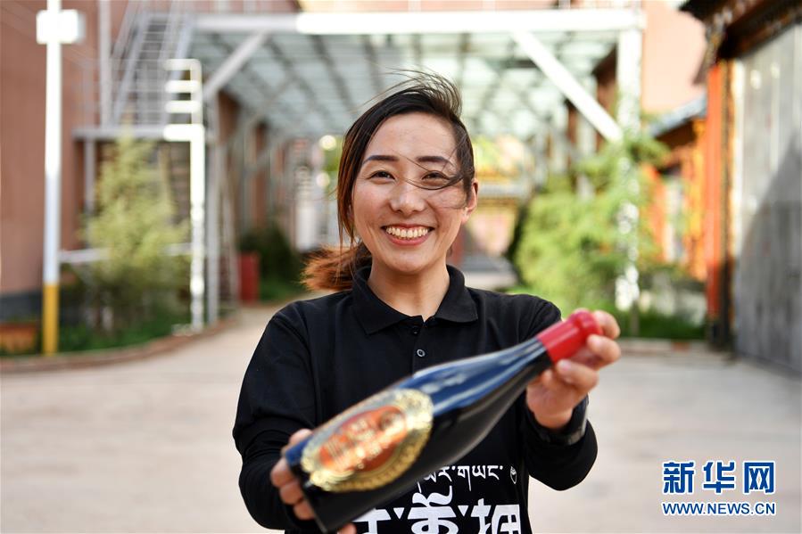 西藏芒康縣藏東珍寶酒業(yè)有限公司副總經(jīng)理曲措在展示一款“達美擁”葡萄酒(5月4日攝)。新華社記者詹彥攝