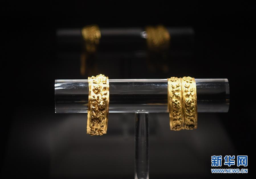 這是在廣東陽(yáng)江海陵島的廣東海上絲綢之路博物館展出的“南海I號(hào)”出土文物金鉗鐲(5月12日攝)。新華社記者鄧華攝