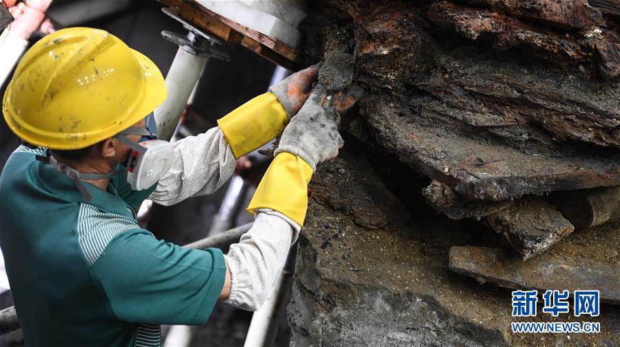 這是位于廣東陽(yáng)江海陵島的“南海I號(hào)”已清理出的船艉部分(5月12日攝)。新華社記者鄧華攝