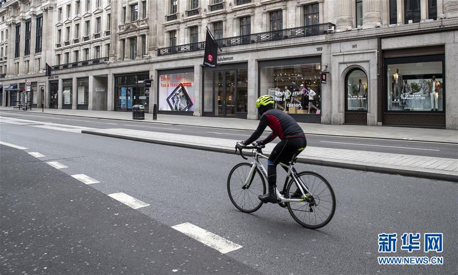 5月12日,在英國倫敦,一名男子騎行經(jīng)過攝政街關(guān)閉的店鋪。新華社記者韓巖攝