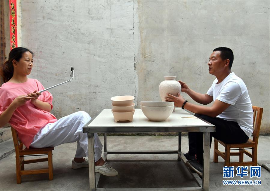 5月13日,寶豐縣大營鎮(zhèn)的汝瓷藝人宋召冰(右)在汝瓷作坊直播介紹修飾素胎工藝。新華社記者李嘉南攝