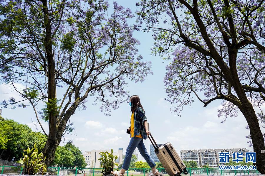5月15日,西南大學(xué)校園內(nèi)的藍花楹樹下,一名學(xué)生拖著行李箱向宿舍走去。當(dāng)日,重慶西南大學(xué)迎來疫情以來首批返校大學(xué)生。據(jù)介紹,按照疫情防控的需要,重慶市高校2020年春季學(xué)期從5月11日起按照“一校一策”原則,實行錯峰錯時分批次有序開學(xué)復(fù)課。新華社記者劉潺攝