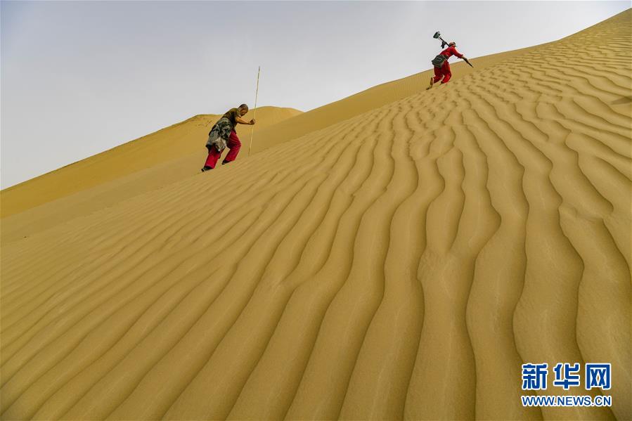 在新疆尉犁至且末沙漠公路施工現(xiàn)場,測繪員劉耀軍(前)和助手甘才云翻越一處高約40米的沙丘(5月17日攝)。新華社記者胡虎虎攝
