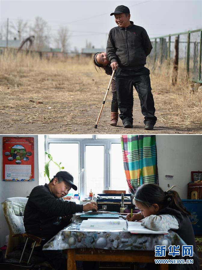 拼版照片上圖:在錫尼河鎮(zhèn)的出租房外,米格木爾(前)和女兒南吉樂瑪一起玩耍;下圖:在錫尼河鎮(zhèn)的出租房內,米格木爾在進行皮雕,女兒南吉樂瑪在溫習功課(照片均攝于4月15日)。2016年,家住內蒙古鄂溫克族自治旗錫尼河鎮(zhèn)孟根礎魯嘎查的米格木爾因為缺失勞動能力成了建檔立卡貧困戶。獨自撫養(yǎng)女兒的他為了女兒上學離開了牧區(qū)來到鎮(zhèn)上租房陪讀,生活的壓力讓米格木爾犯了難。2018年春天,他通過當?shù)孛褡逦幕a(chǎn)業(yè)創(chuàng)業(yè)園舉辦的皮雕手藝培訓,讓他居家賺錢、陪讀兩不誤,逐步實現(xiàn)穩(wěn)定脫貧。2020年4月,我國第一個成立的少數(shù)民族自治區(qū)——內蒙古自治區(qū)宣告全面脫貧“摘帽”。黨的十八大以來,我們堅持以人民為中心的發(fā)展思想,明確了到2020年我國現(xiàn)行標準下農(nóng)村貧困人口實現(xiàn)脫貧、貧困縣全部摘帽、解決區(qū)域性整體貧困的目標任務。目前看,脫貧進度符合預期,成就舉世矚目。這些成績的取得,凝聚了全黨全國各族人民智慧和心血,是廣大干部群眾扎扎實實干出來的。脫貧摘帽不是終點,而是新生活、新奮斗的起點。新華社記者劉磊攝