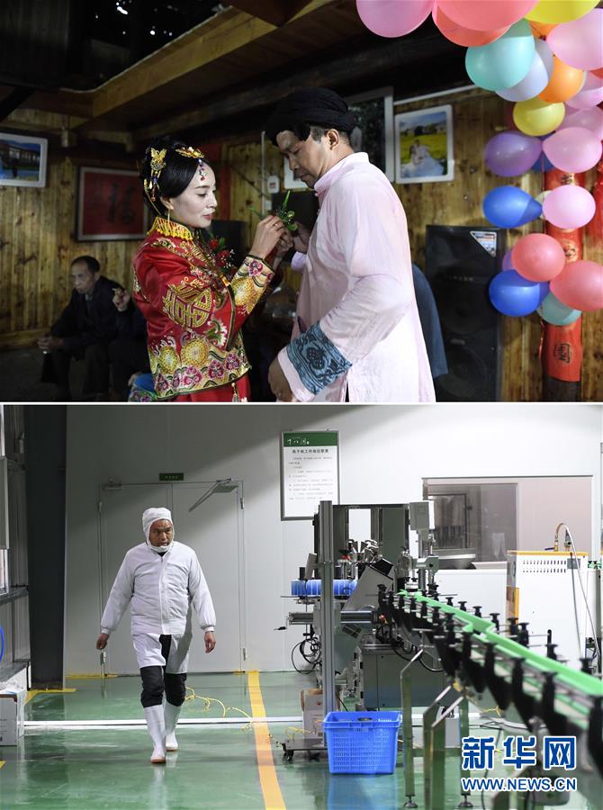 拼版照片上圖:婚禮開始前,吳春霞(左)為施六金佩戴胸花(2018年9月24日攝);下圖:施六金在十八洞村新建的山泉水廠里工作(2018年2月3日攝)。地處武陵山腹地的湖南湘西土家族苗族自治州花垣縣十八洞村曾深陷貧困。2013年,村里225戶中有136戶是貧困戶,40歲以上的“光棍兒”有30多人。2014年以來,十八洞村逐漸蛻變。2016年初,結(jié)束外出打工的施六金返鄉(xiāng)辦起“苗家樂”。2017年,村里的十八洞村山泉水廠正式建成投產(chǎn),他受聘成為廠里的技術(shù)工人,每月都有固定工資。隨著日子越過越好,許多像施六金這樣摘了窮帽的大齡“光棍兒”收獲了愛情,實現(xiàn)了安居樂業(yè),事業(yè)愛情雙豐收。黨的十八大以來,我們堅持以人民為中心的發(fā)展思想,明確了到2020年我國現(xiàn)行標準下農(nóng)村貧困人口實現(xiàn)脫貧、貧困縣全部摘帽、解決區(qū)域性整體貧困的目標任務(wù)。目前看,脫貧進度符合預(yù)期,成就舉世矚目。這些成績的取得,凝聚了全黨全國各族人民智慧和心血,是廣大干部群眾扎扎實實干出來的。脫貧摘帽不是終點,而是新生活、新奮斗的起點。新華社記者李尕攝