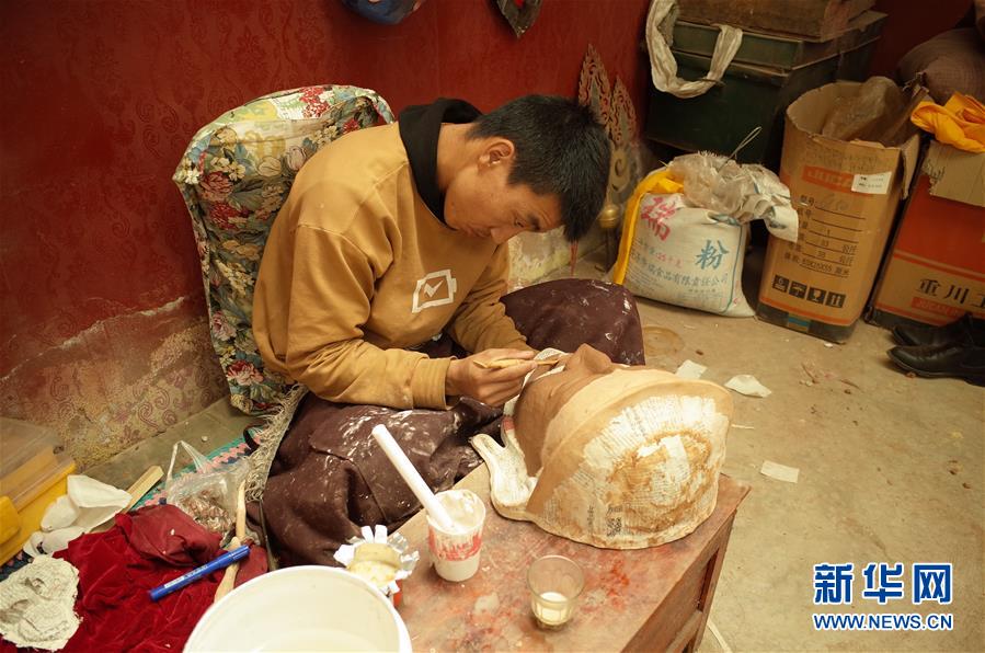 在西藏拉薩市達孜區(qū),西洛的學徒旦增扎西在給面具塑形(5月15日攝)。新華社記者格桑邊覺攝