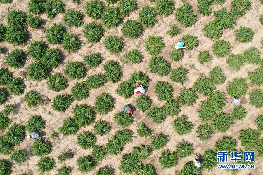 5月21日,河北省清河縣農墾金銀花種植專業(yè)合作社社員在采收金銀花(無人機照片)。2017年以來,河北省清河縣在推進農業(yè)產業(yè)結構調整過程中,結合市場需求,立足當?shù)赝寥?、氣候特點,依托公司“訂單”引導農民發(fā)展金銀花種植。目前,清河縣金銀花種植面積近2000畝,帶動40多個村莊的2000余名農民人均增收千元以上。新華社記者牟宇攝