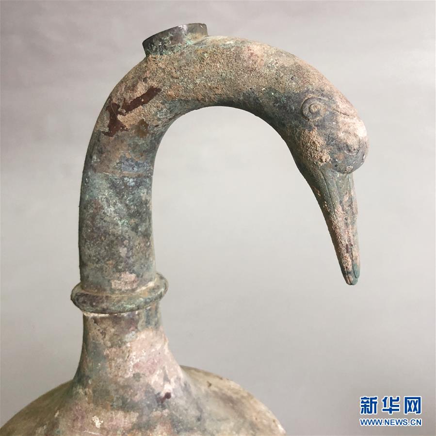 新華社鄭州5月23日電(記者李麗靜)河南省三門峽市文物考古研究所的考古工作者近日在當?shù)匾粋€發(fā)掘現(xiàn)場,發(fā)現(xiàn)一個鵝首曲頸青銅壺。頂部的鵝首造型姿態(tài)優(yōu)美,壺中還存有不明液體逾3000ml。