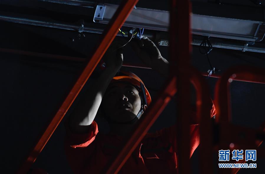 5月23日,工人在??谖拿鳀|越江通道項目隧道內安裝照明設備。新華社記者楊冠宇攝