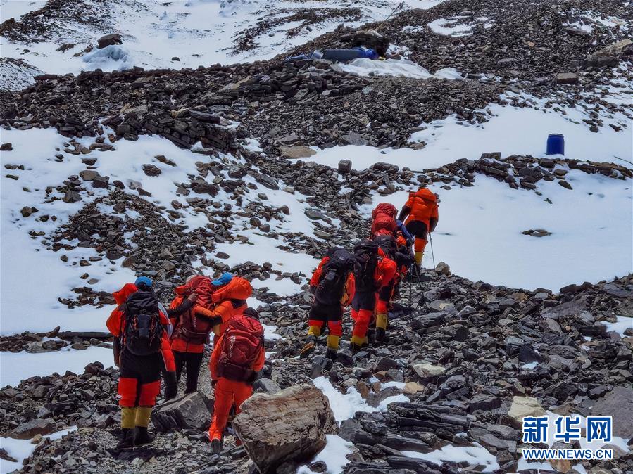 5月24日,2020珠峰高程測(cè)量登山隊(duì)部分人員從海拔6500米的前進(jìn)營(yíng)地出發(fā)。