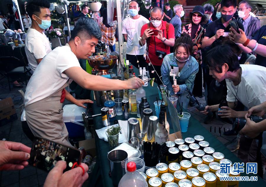 5月24日,調酒師在上海思南公館露天夜市進行網絡直播。入夏以來,上海思南公館推出“思南夜派對”夜間經濟大排檔,包括生活市集、深夜食堂、夜游露天博物館等板塊,匯集了國潮品牌、創(chuàng)意美食、藝術衍生品等攤位,為公眾帶來一站式夜間休閑“加油站”,促進夜間消費。新華社記者陳飛攝