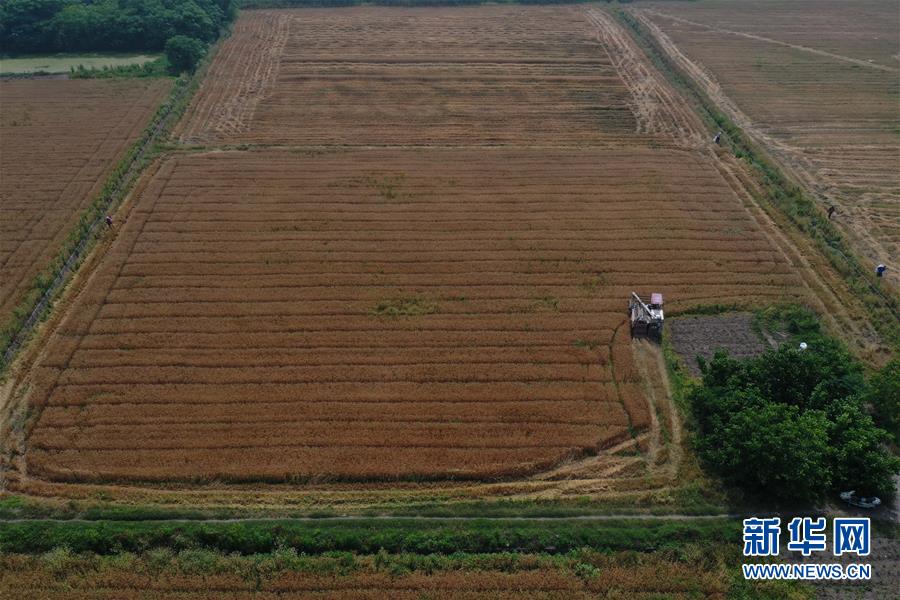 5月24日,農(nóng)戶駕駛收割機(jī)在浙江省湖州市吳興區(qū)八里店鎮(zhèn)尹家圩糧油植保農(nóng)機(jī)專業(yè)合作社的麥田里進(jìn)行收割作業(yè)(無人機(jī)照片)。新華社記者黃宗治攝