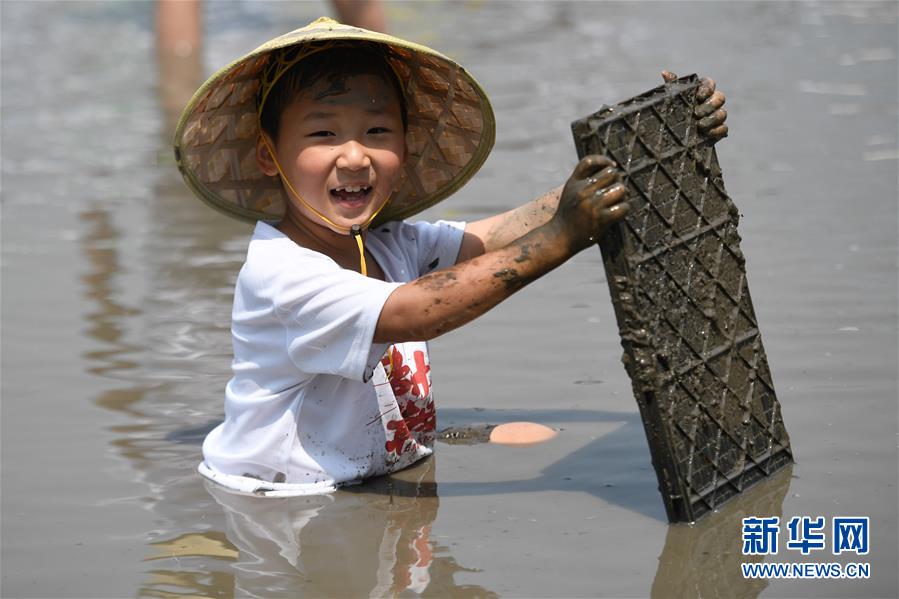 5月24日,一名小朋友在稻田里體驗(yàn)農(nóng)事。當(dāng)日,十余名小朋友在家長(zhǎng)的帶領(lǐng)下來(lái)到浙江省湖州市吳興區(qū)八里店鎮(zhèn)尹家圩糧油植保農(nóng)機(jī)專業(yè)合作社的稻田中,參加親子插秧、稻田捉魚等農(nóng)事體驗(yàn)活動(dòng)。新華社記者黃宗治攝