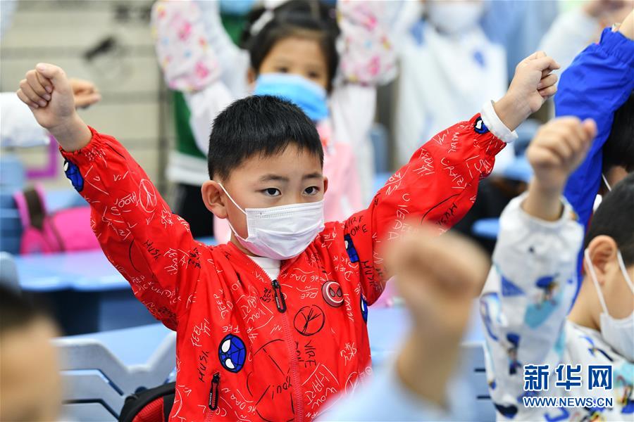 5月25日,廣州市荔灣區(qū)蔣光鼐紀念小學的老師在給學生上開學第一課。當日,廣州市各小學一至三年級學生正式開學復課。至此,廣州市中小學各年級已全部開學復課。新華社記者盧漢欣攝