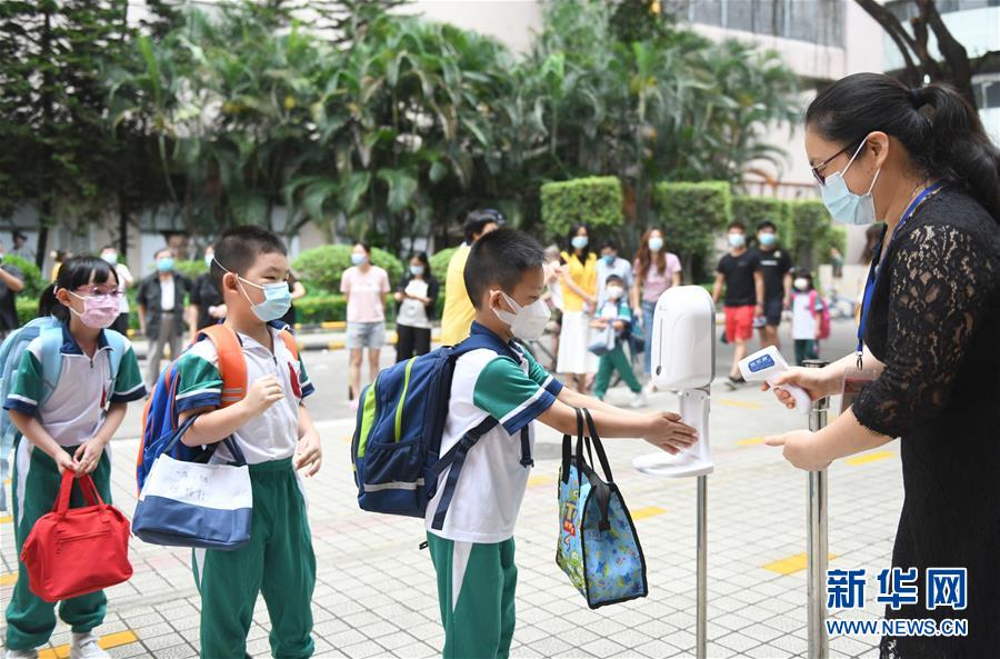 5月25日,廣州市荔灣區(qū)蔣光鼐紀(jì)念小學(xué)的老師在校門(mén)口為返校學(xué)生檢測(cè)體溫。當(dāng)日,廣州市各小學(xué)一至三年級(jí)學(xué)生正式開(kāi)學(xué)復(fù)課。至此,廣州市中小學(xué)各年級(jí)已全部開(kāi)學(xué)復(fù)課。新華社記者盧漢欣攝
