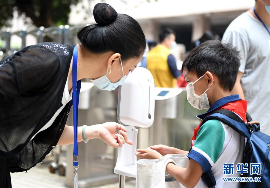 5月25日,廣州市荔灣區(qū)蔣光鼐紀(jì)念小學(xué)的老師在校門口指導(dǎo)返校的學(xué)生進(jìn)行手部消毒。當(dāng)日,廣州市各小學(xué)一至三年級(jí)學(xué)生正式開學(xué)復(fù)課。至此,廣州市中小學(xué)各年級(jí)已全部開學(xué)復(fù)課。新華社記者盧漢欣攝