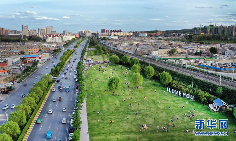 5月24日,市民在榆林市城市綠化帶休閑(無人機(jī)照片)。新華社記者陶明攝