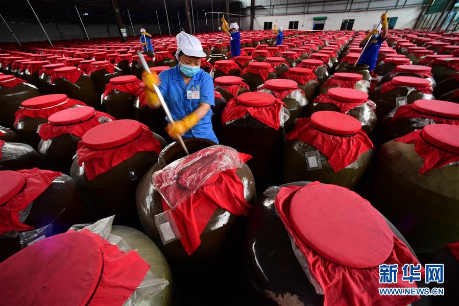 5月26日,工人在貴州省黔東南苗族侗族自治州麻江縣明洋食品公司生產(chǎn)車間攪拌釀造過(guò)程中的酸湯原料。