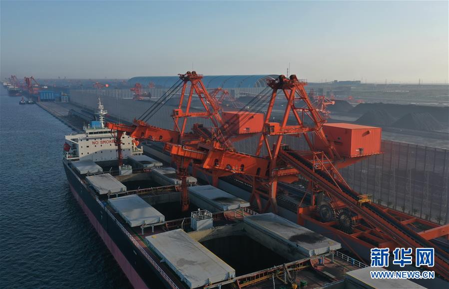 5月22日,一艘輪船靠泊在唐山港曹妃甸港區(qū)煤碼頭三期工程的先期工程泊位裝貨(無人機(jī)照片)。