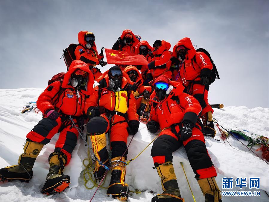 5月27日,2020珠峰高程測(cè)量登山隊(duì)在峰頂合影留念。