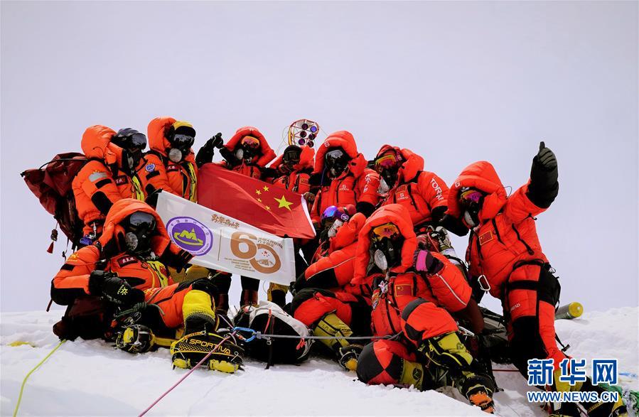 5月27日,2020珠峰高程測(cè)量登山隊(duì)在峰頂合影留念。